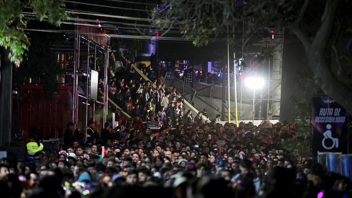 People leave the amphitheatre of the International Song Festival after the suspension of the performance during a blackout in Vina del Mar, Chile