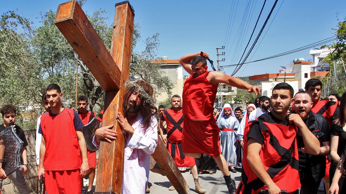 Lebanese men were photographed in the village of Qrayyeh carrying large wooden crosses as they donned white robes and mock crowns of thorns.