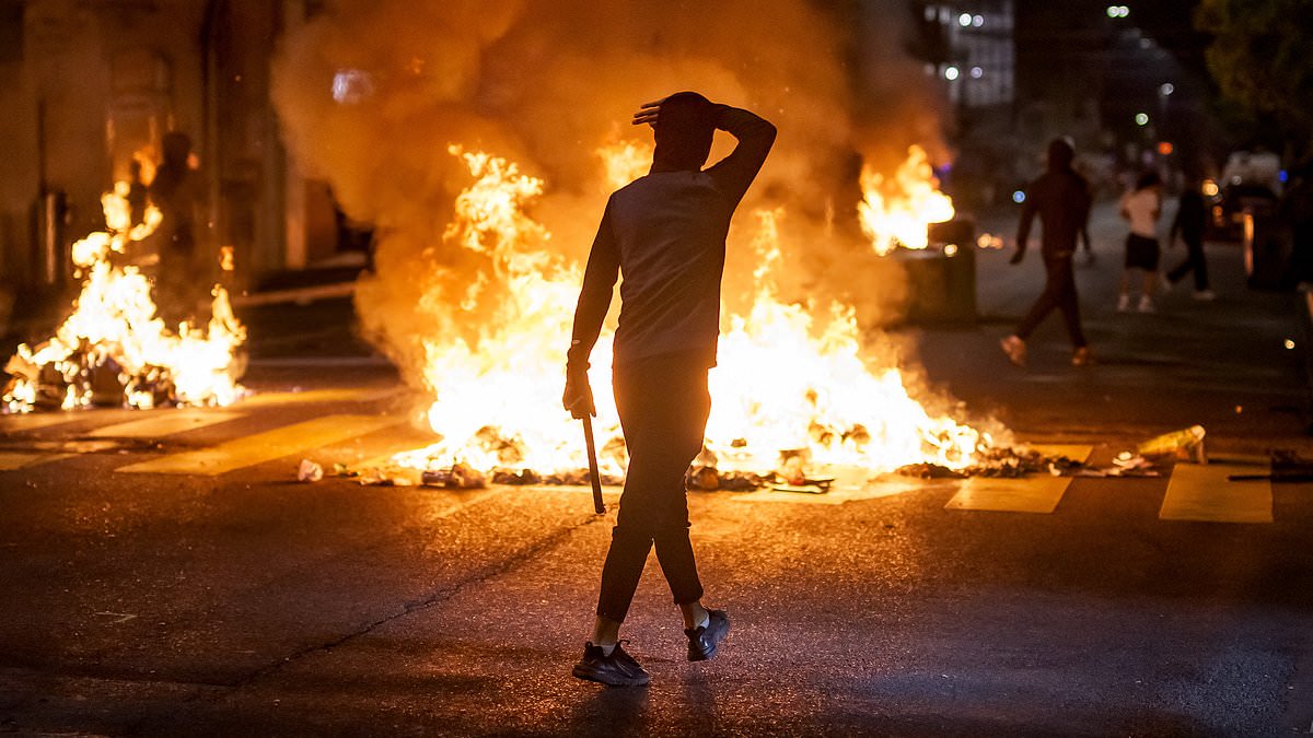 A young person walks past fires in a street, in Lausanne, on August 25, 2025