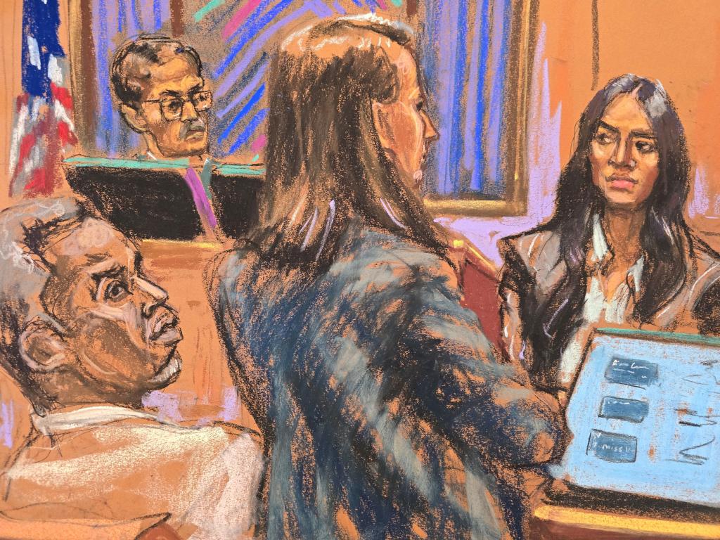 Sketch of lawyer Anna Estevao cross examining Casandra 'Cassie' Ventura, with Judge Arun Subramanian presiding over Sean 'Diddy' Combs' sex trafficking trial in New York City, May 16, 2025.