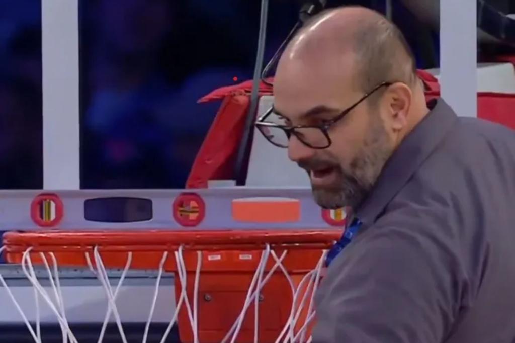 A Knicks worker measures the rim with a level after some thought the rim was crooked after OG Anunoby’s dunk in the second half, but it was determined the rim was OK and play resumed after a short delay. @NBA_NewYork / X