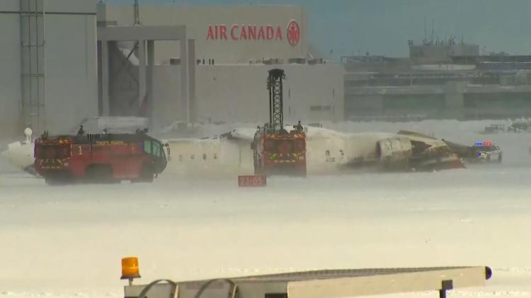 A person who said he was on the plane posted a video on social media showing the plane flipped upside down with smoke emerging from the jet. The plane was somewhat obscured by snow from a winter storm that hit Toronto over the weekend.
