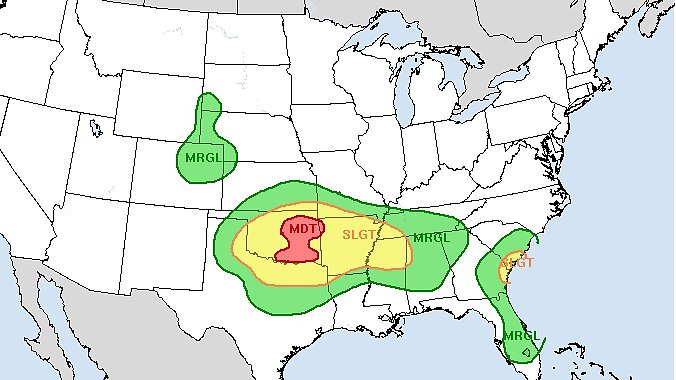 Forecasters identified central Oklahoma as the danger zone for tornadoes, while Memphis, Oklahoma City, Tulsa and Birmingham are most at-risk for hail.