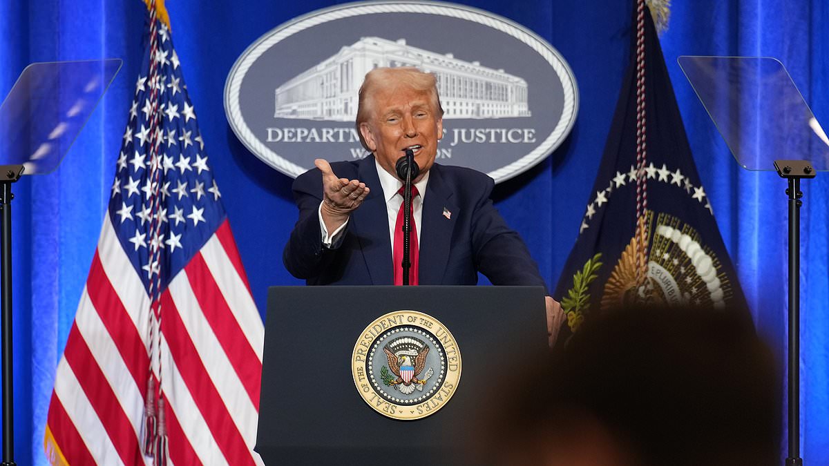 ‘We are turning the page on four long years of corruption, weaponization and surrender to violent criminals and we are restoring fair, equal and impartial justice under the law,’ Trump said, standing before the seal of the Department of Justice.