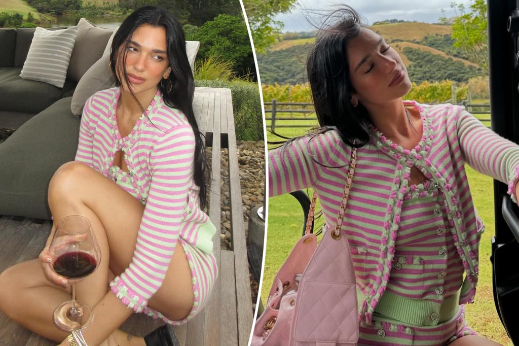 Prior to her highly anticipated concerts in New Zealand as part of the Radical Optimism tour, Dua Lipa, 29 years old, enjoyed a day of wine tasting with her family. For the occasion, she was seen donning a chic ensemble in pastel green and pink stripes from Chanel’s spring 2025 collection.