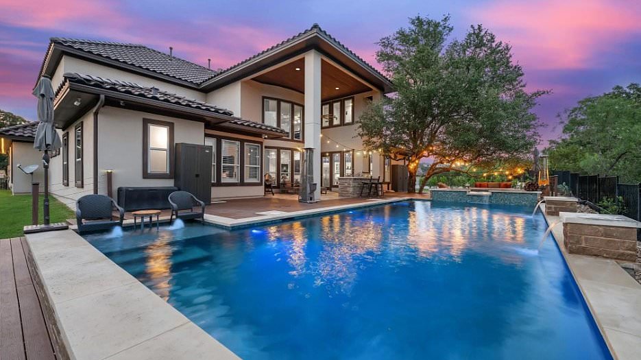 This eye-catching, four-bedroom, five-bathroom home is about one hour’s drive northwest of downtown Austin, and close to a yacht club on the Colorado River.Â