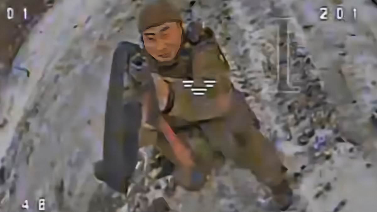 Purportedly the moment a North Korean soldier slips over in front of a Ukrainian drone