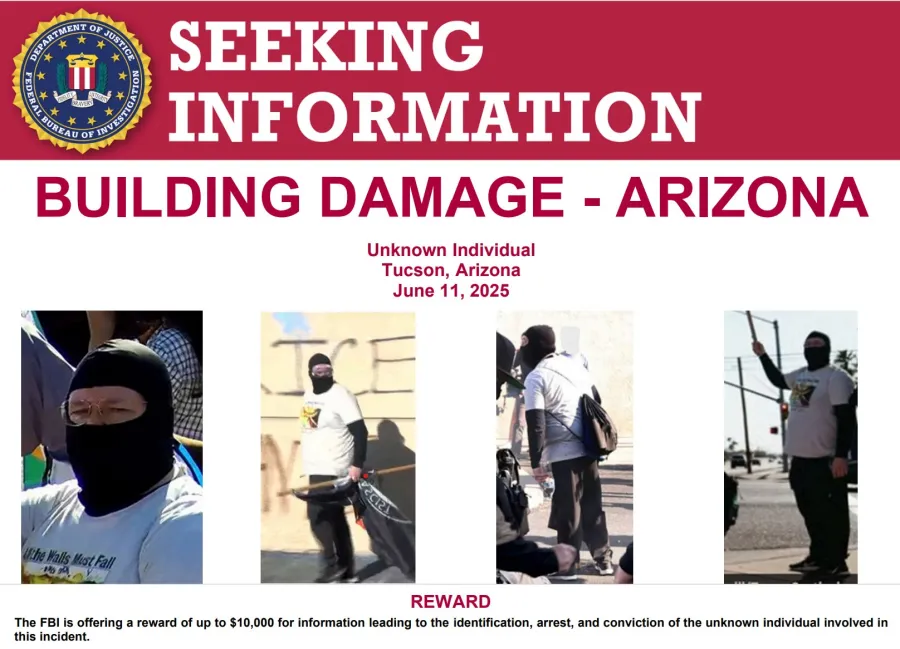 Federal authorities have announced a reward of up to $10,000 for information leading to the identification of a masked individual responsible for vandalizing an Immigration and Customs Enforcement (ICE) building in Tucson, Arizona, earlier this year.