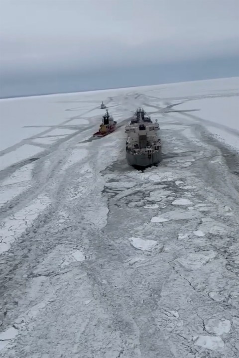 Freighter on the move after it was freed from ice on frozen Lake Erie