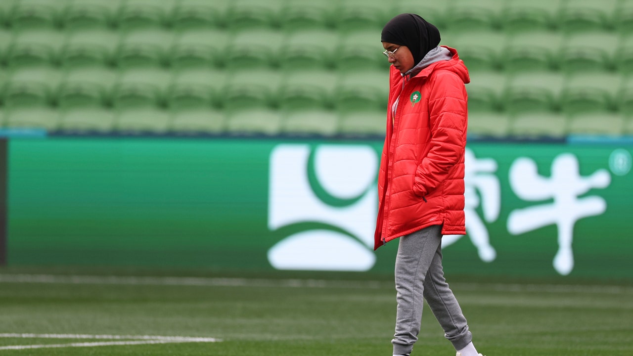 Morocco’s Nouhaila Benzina walks around the ground during a familiarization tour ahead of her Women’s World Cup Group H match with Germany in Melbourne, Australia, on July 23, 2023. (AP Photo/Victoria Adkins, File)