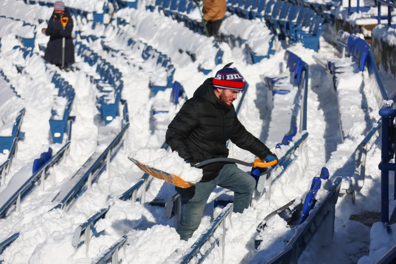 FILE - A stadium worker clears snow from seats before an NFL wild-card playoff football game between the Buffalo Bills and the Pittsburgh Steelers, Jan. 15, 2024, in Buffalo, N.Y. (AP Photo/Jeffrey T. Barnes, File)