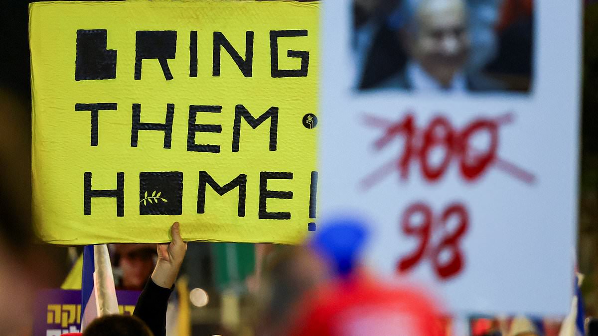On Sunday night, Israelis rallied again in the city of Tel Aviv, with photos of hostages on display.
