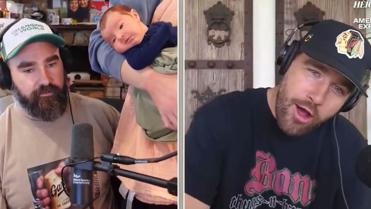 Travis Kelce met his new niece Finnley for the first time while recording New Heights