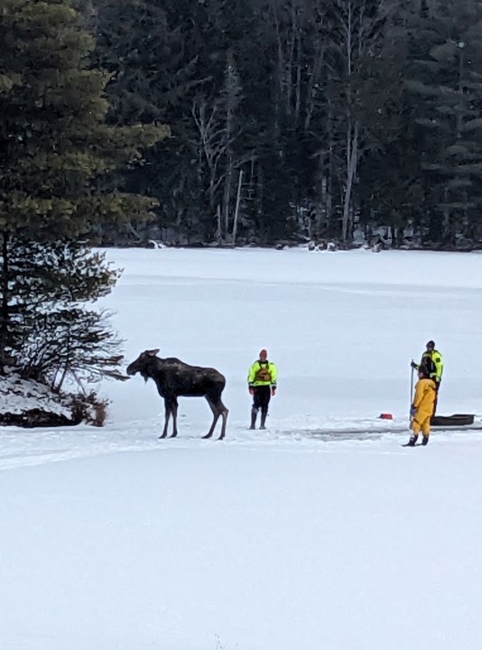 Higgins was dispatched to the lake thanks to a passerby who saw the moose break through the ice and called it in. Higgins asked for backup, and was quickly joined by a pair of forest rangers.