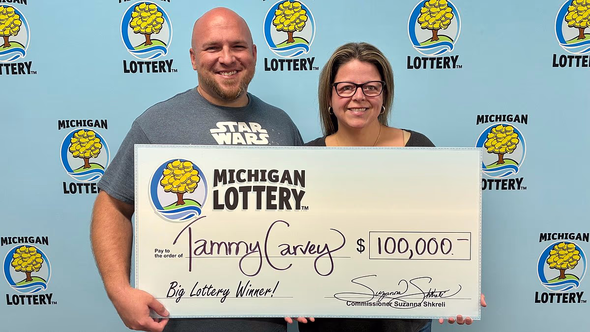 ‘It wasn’t until I logged into my Michigan Lottery account that I realized I added the Power Play to my ticket and actually won $100,000! My husband and I were in total disbelief.’