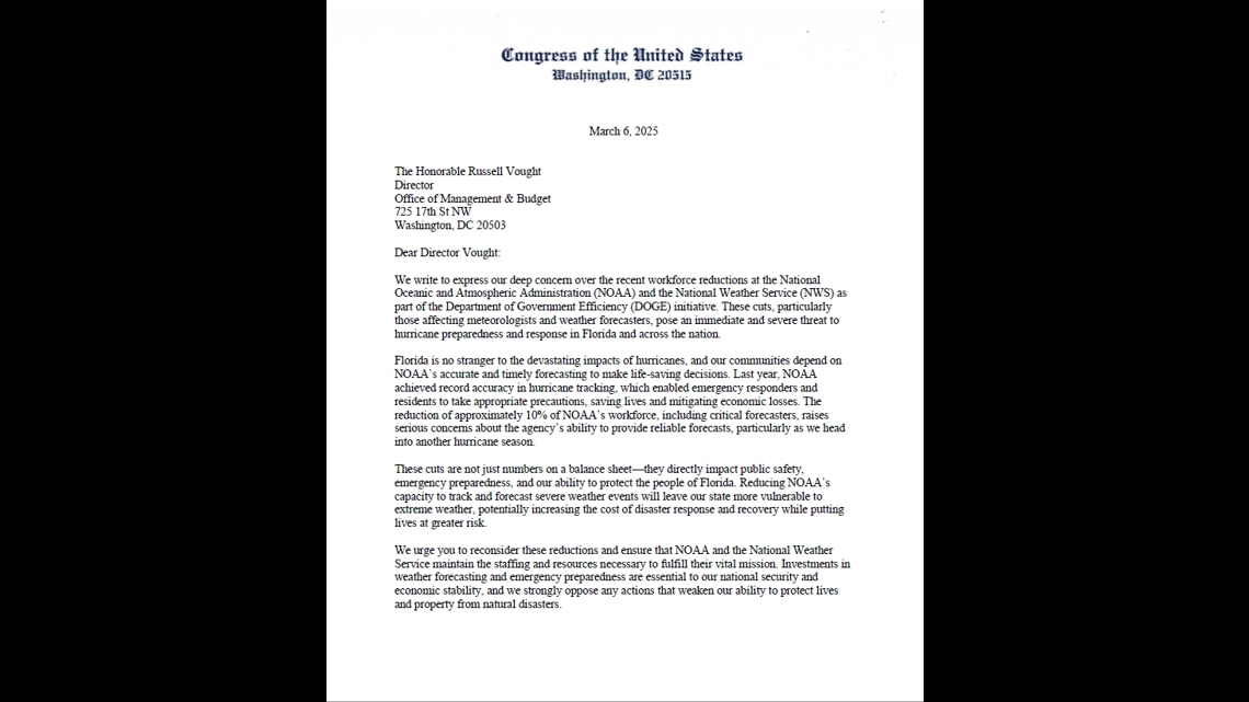 “These cuts, particularly those affecting meteorologists and weather forecasters, pose an immediate and severe threat to hurricane preparedness and response in Florida and across the nation,” reads the letter.