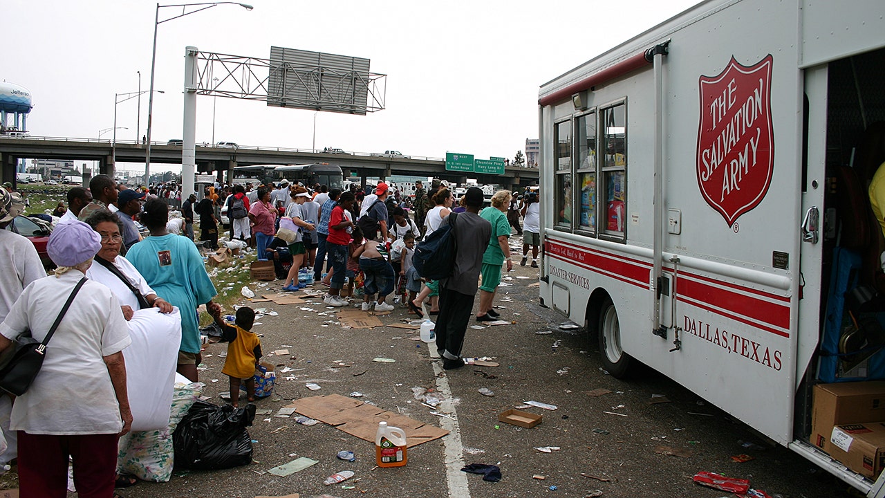 Volunteers with the Salvation Army provide food and aid to those impacted by the destruction from Hurricane Katrina in August 2005.  (The Salvation Army)