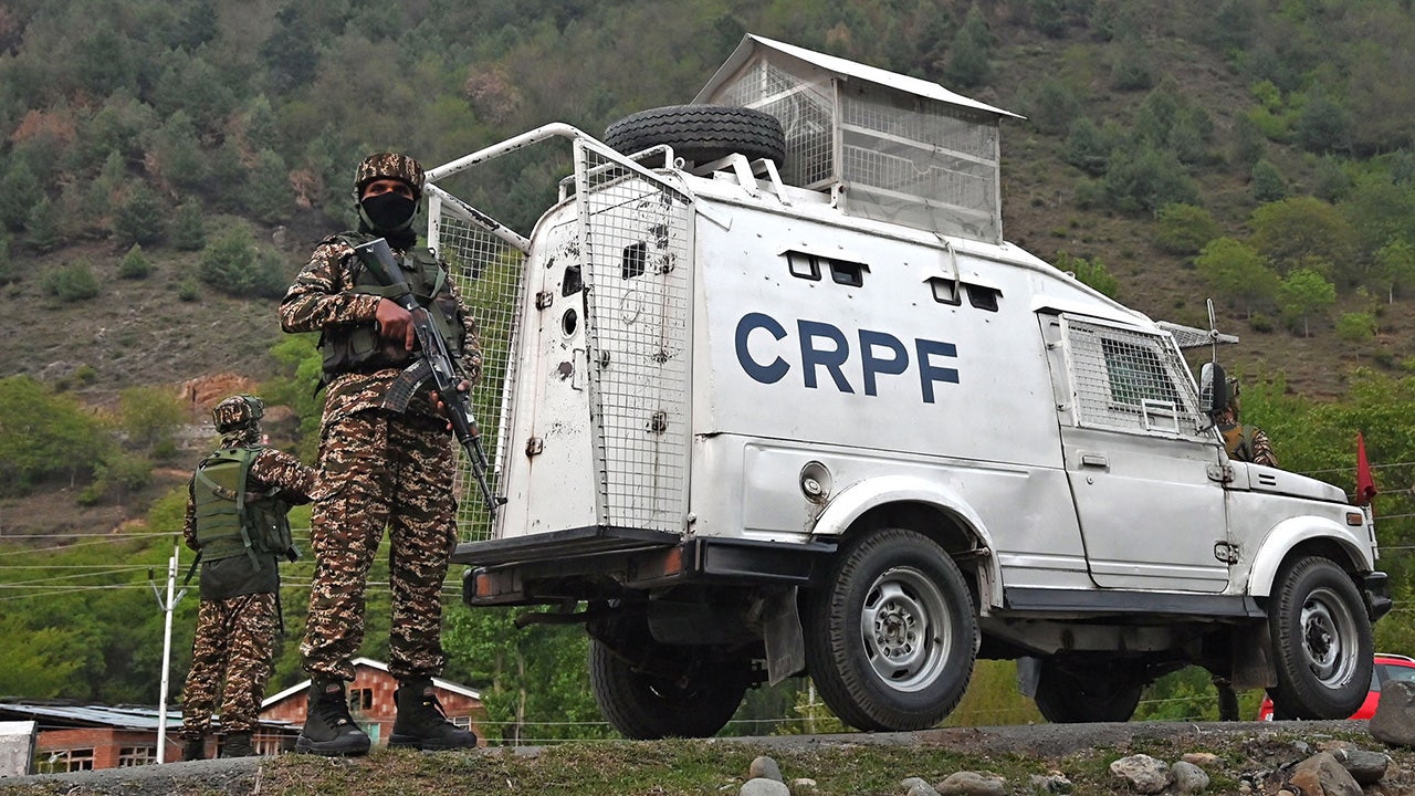 Paramilitary soldiers stand guard near Pahalgam on April 22 in India. More than 20 people, mainly tourists, were killed in a terrorist attack in Pahalgam in Jammu and Kashmir’s Anantnag district on Tuesday. (Waseem Andrabi/Hindustan Times via Getty Images)