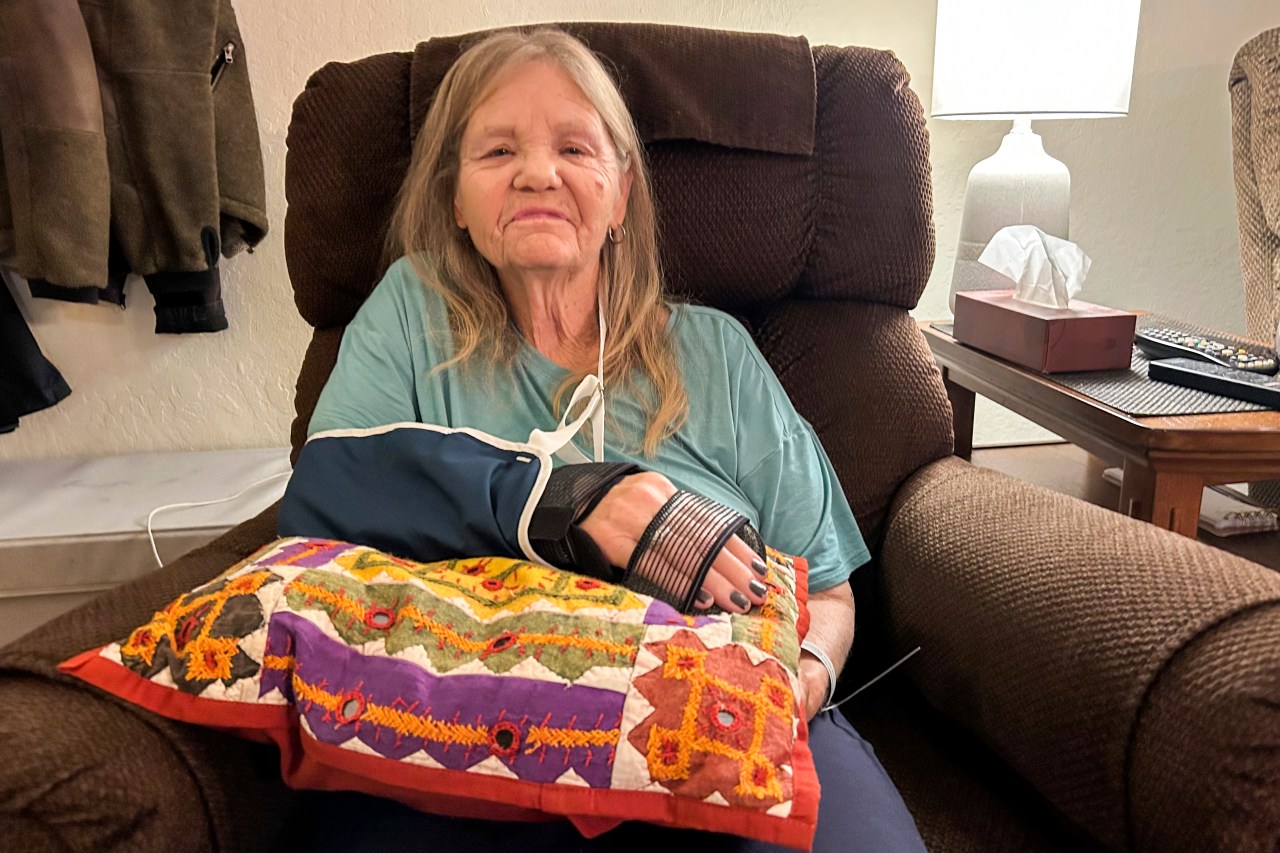This photo provided by Tricia Peterson shows Sharon Tanner, a resident at the Terraces at Park Marino, in Pasadena, Calif., on Jan. 13, 2025. (Tricia Peterson via AP)