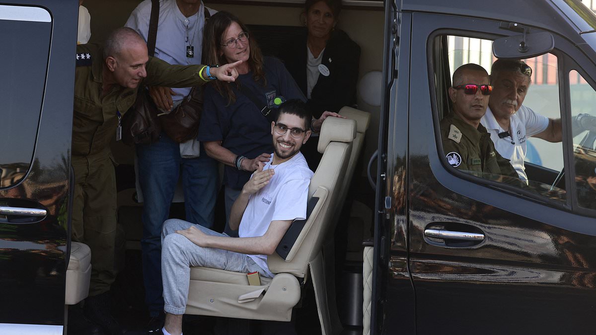Released hostage Avinatan Or, who was kidnapped during the deadly October 7, 2023 attack by Hamas and taken to Gaza, upon arrival at Rabin Medical Centre-Beilinson Hospital