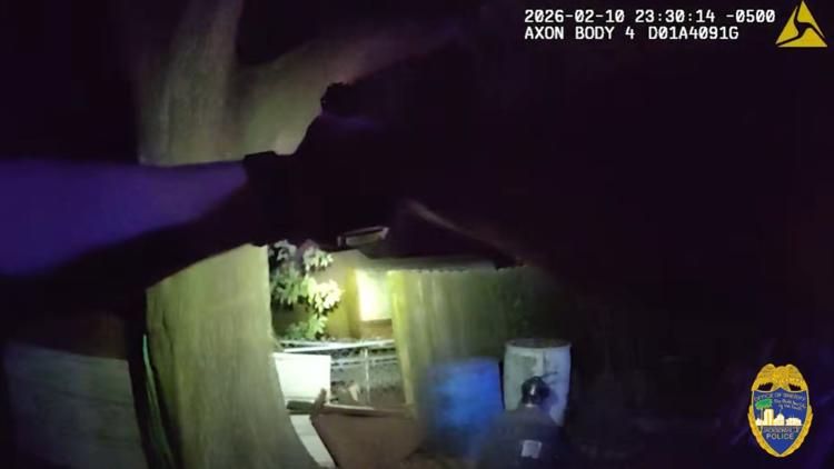The video shows Officer Higgenbotham had his gun drawn from the beginning of the foot pursuit, which he uses to shoot three times at an unleashed dog that approaches him. The dog appears to have been missed and runs away from the officer.