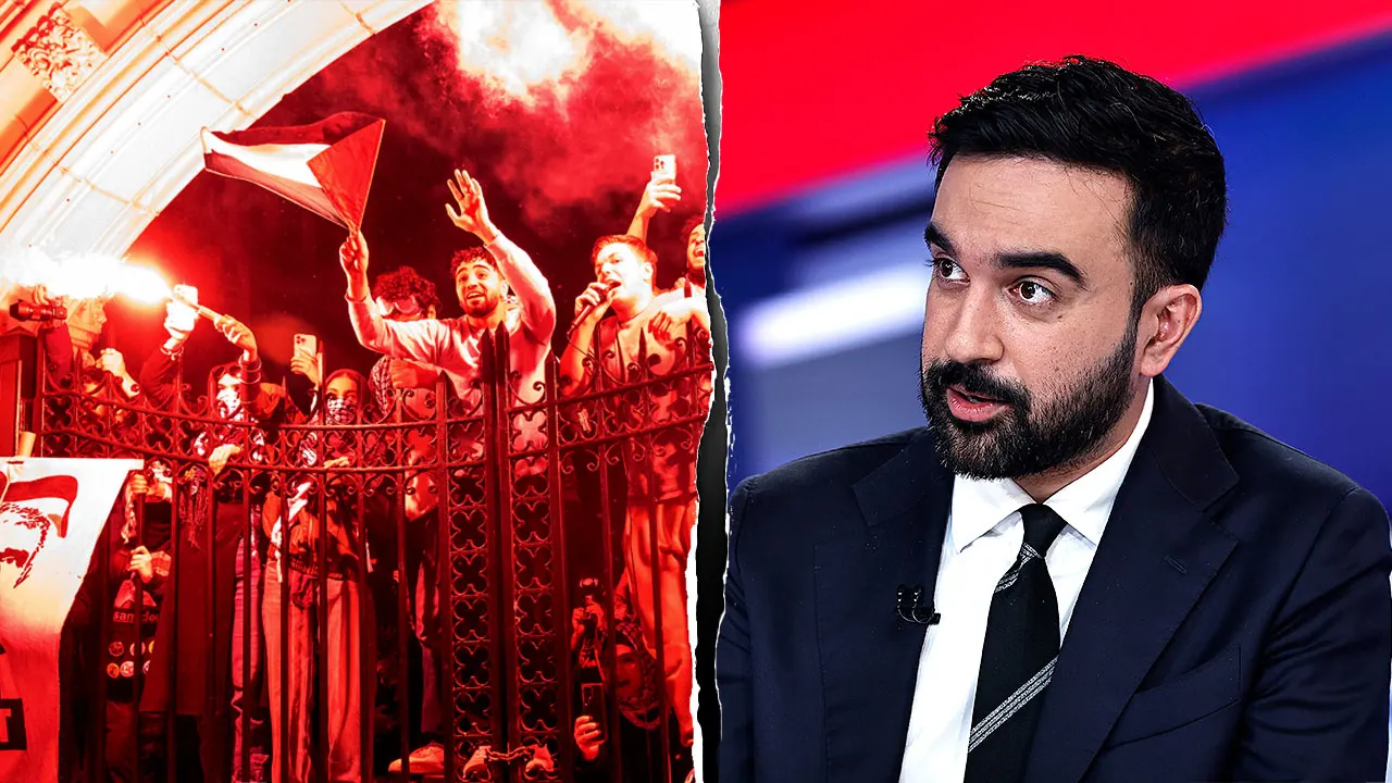 NYC mayor-elect Zohran Mamdani next to a pro-Palestine protest at an NYC university.