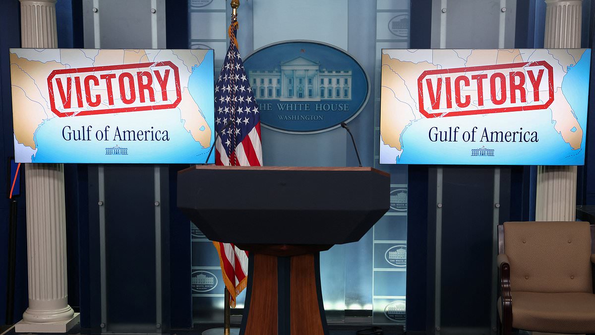 President Trump also celebrated the news, posting a photo of the Briefing Room displaying signs reading ‘Victory: Gulf of America.’