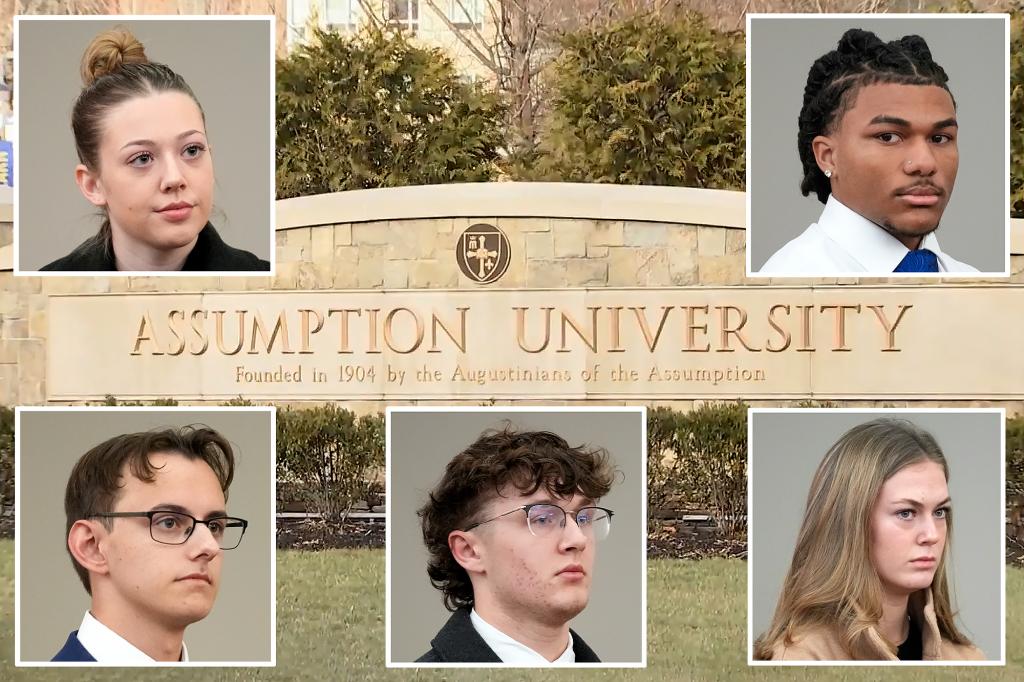 Kelsy Brainard, 18 Easton Randall, 19, Kevin Carroll, 18, Isabella Trudeau, 18, and Joaquin Smith, 18, are accused of using Brainard’s Tinder account to lure their 22-year-old victim to the private Roman Catholic school, 45 miles west of Boston in October.