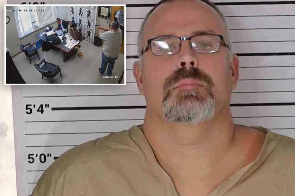 Footage of the fatal shooting shows the top cop pulling out his gun and pointing it at the judge’s head as Mullins tries to turn away and hide behind his desk.
