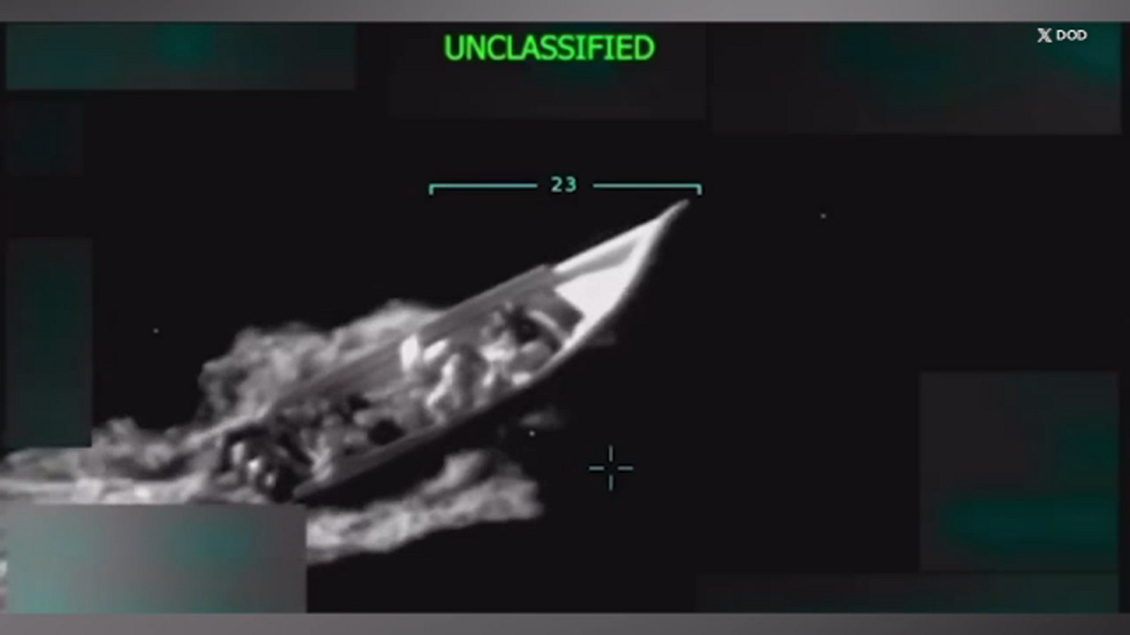 The video appears to show a long, multi-engine speedboat traveling at sea when a bright flash of light bursts over the craft. The boat is then briefly seen covered in flames.