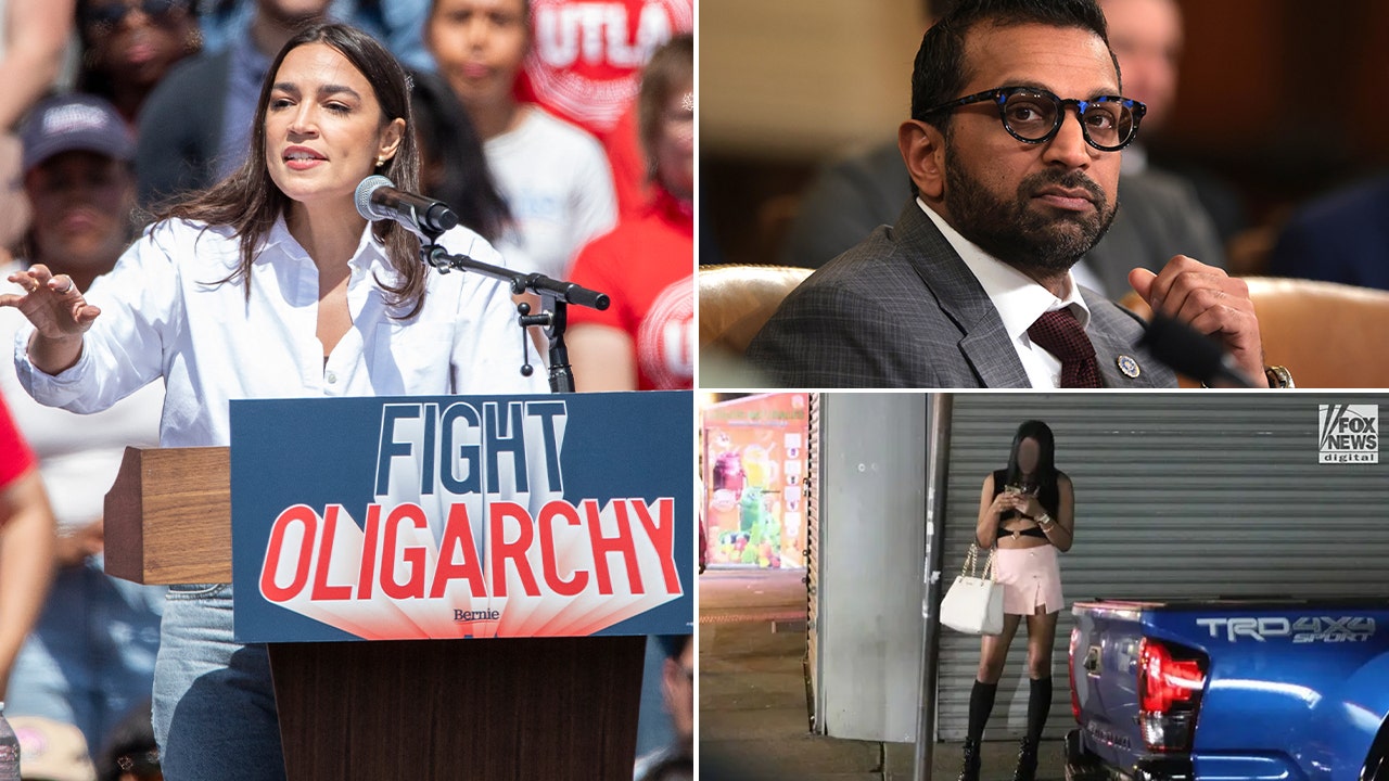Leaders in Rep. Alexandia Ocasio-Cortez’s “Red Light” district are pleading with FBI director Kash Patel to clamp down on rampant prostitution and drug dealing in the Democrat congresswoman’s constituency. Ocasio-Cortez, left, FBI Director Kash Patel, top right, and an alleged sex worker on Roosevelt Avenue, bottom right. (Sam Ghazi / Middle East Images / Middle East Images via AFP, left, Kayla Bartkowski/Getty Images, top right, Fox News’ Michael Dorgan, bottom right. )