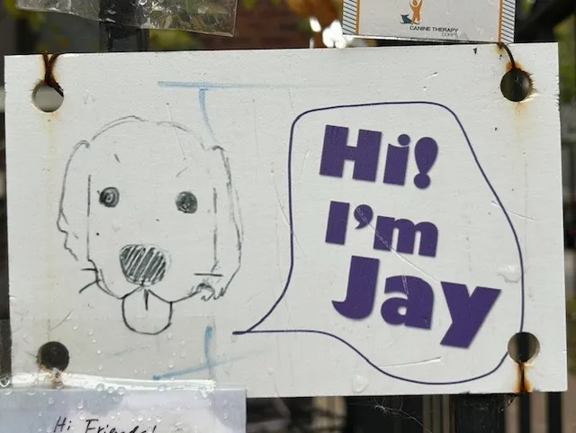 “People loved the sign,” Newman said. “Each time people stop by and pet him and say ‘hi Jay’ he gets so happy, lies down and shows his belly.”