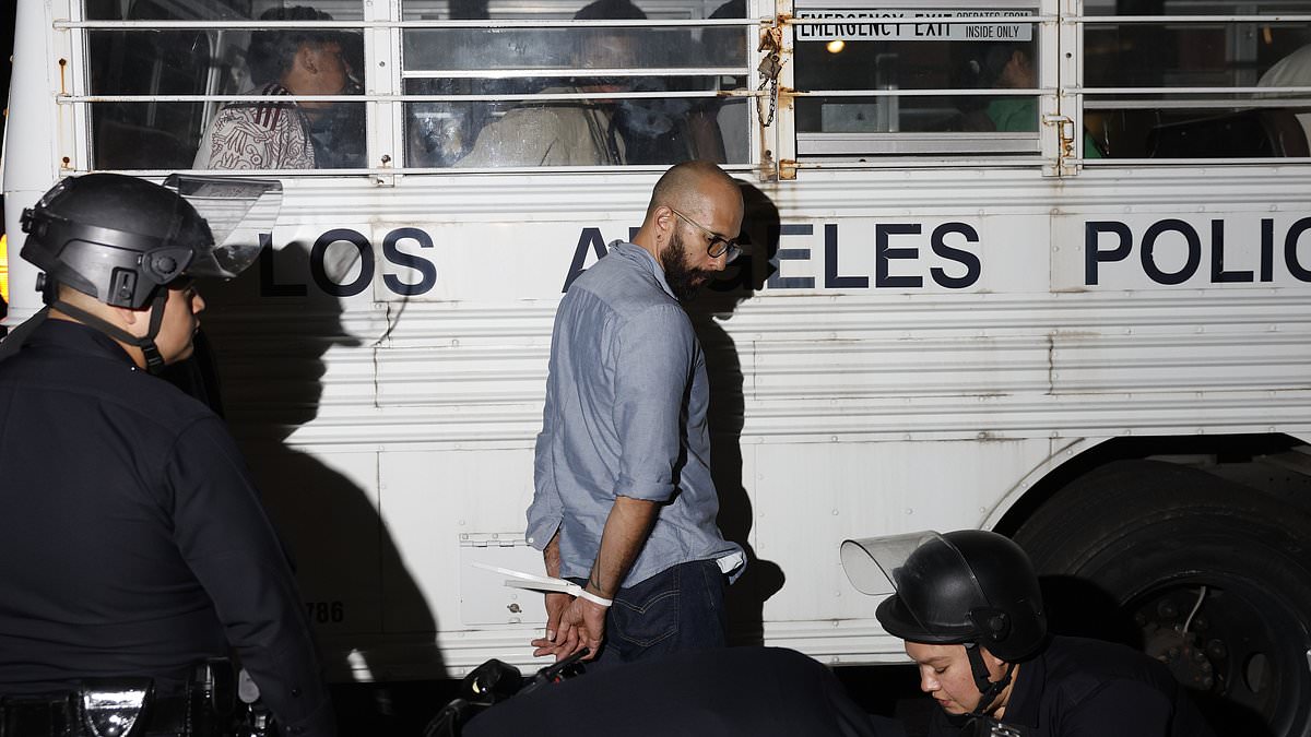 Extraordinary footage showed rioters – who had driven Downtown LA to a standstill for four days – zip-tied and forced onto LAPD buses en masse as authorities sought to bring an end to days of chaos and destruction.
