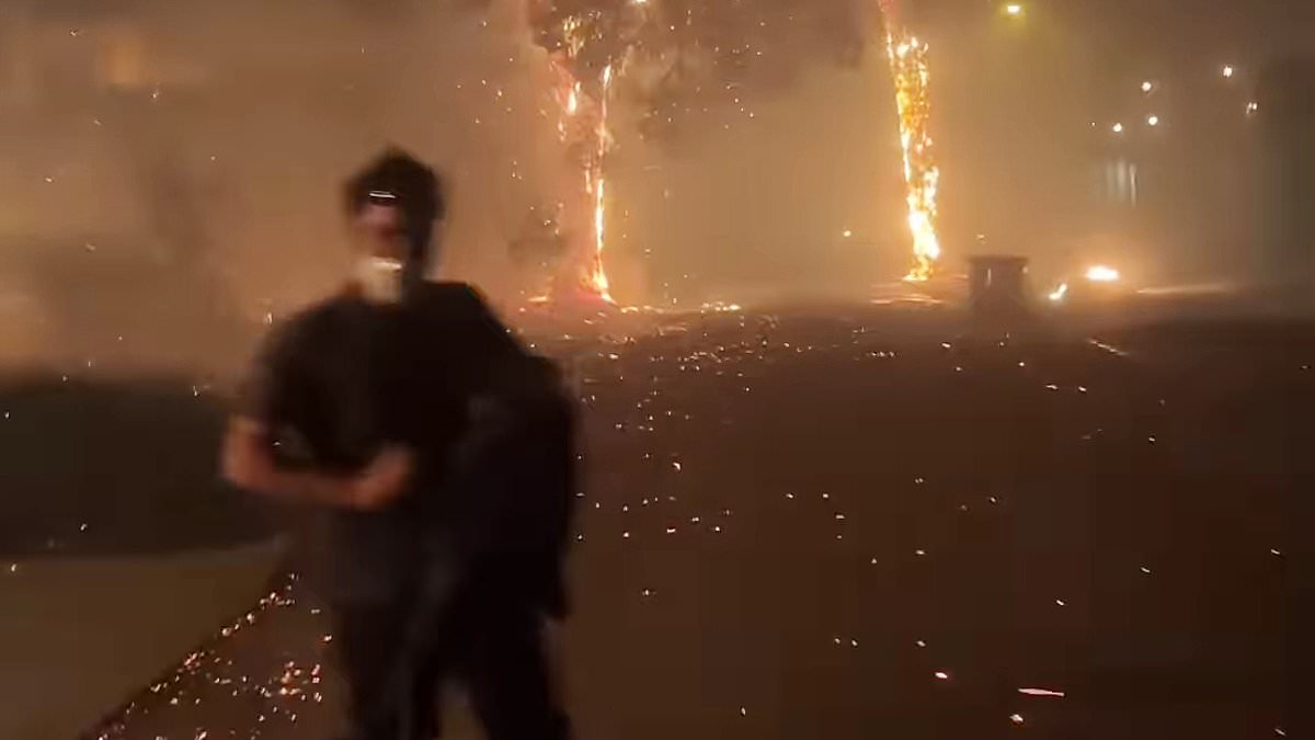Another frightening moment showed trees in the yard on fire while sparks filled the night sky