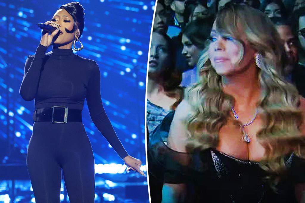 During Long’s rendition of “We Belong Together,” the camera focused on Carey, who was seen turning her head and giving a serious side-eye look while others danced around her.