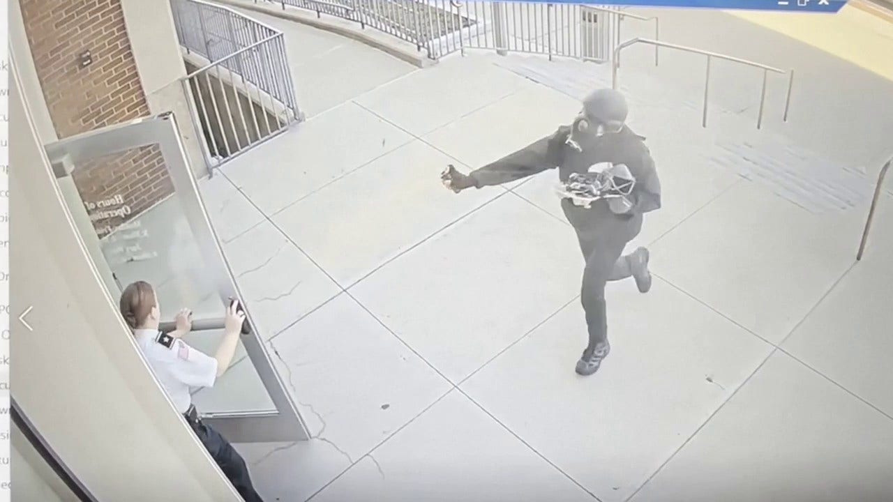 Security footage from the courthouse shows a man wearing a helmet, gas mask, tactical boots and sunglasses walk up to the building as a court officer opens the front door. The man is then seen spraying pepper spray at the officer and barging into the courthouse.