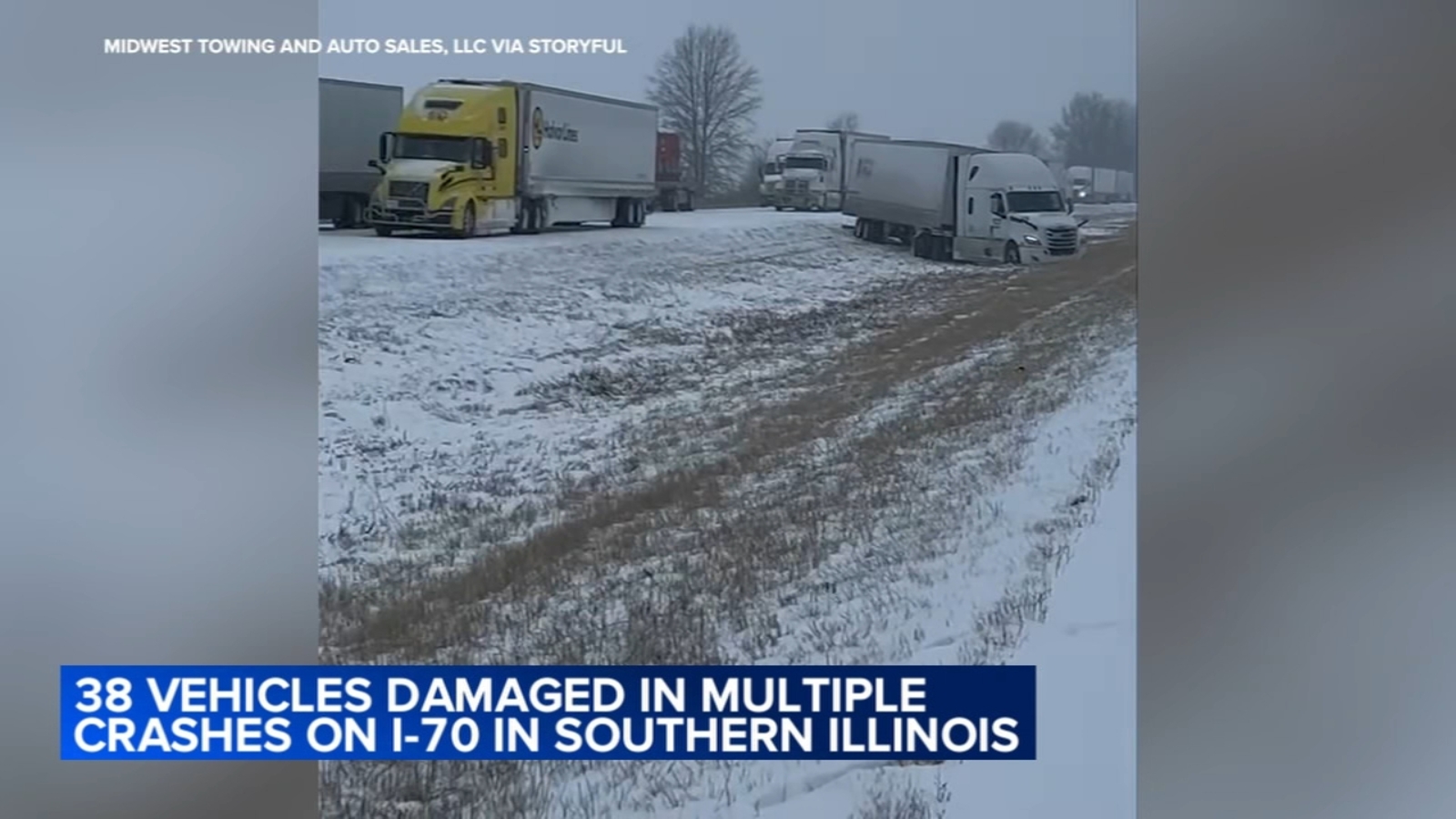 CUMBERLAND COUNTY, Ill. (WLS) — Dozens of vehicles were involved in a crash downstate Illinois Sunday afternoon as snow coated roadways, Illinois State Police said.