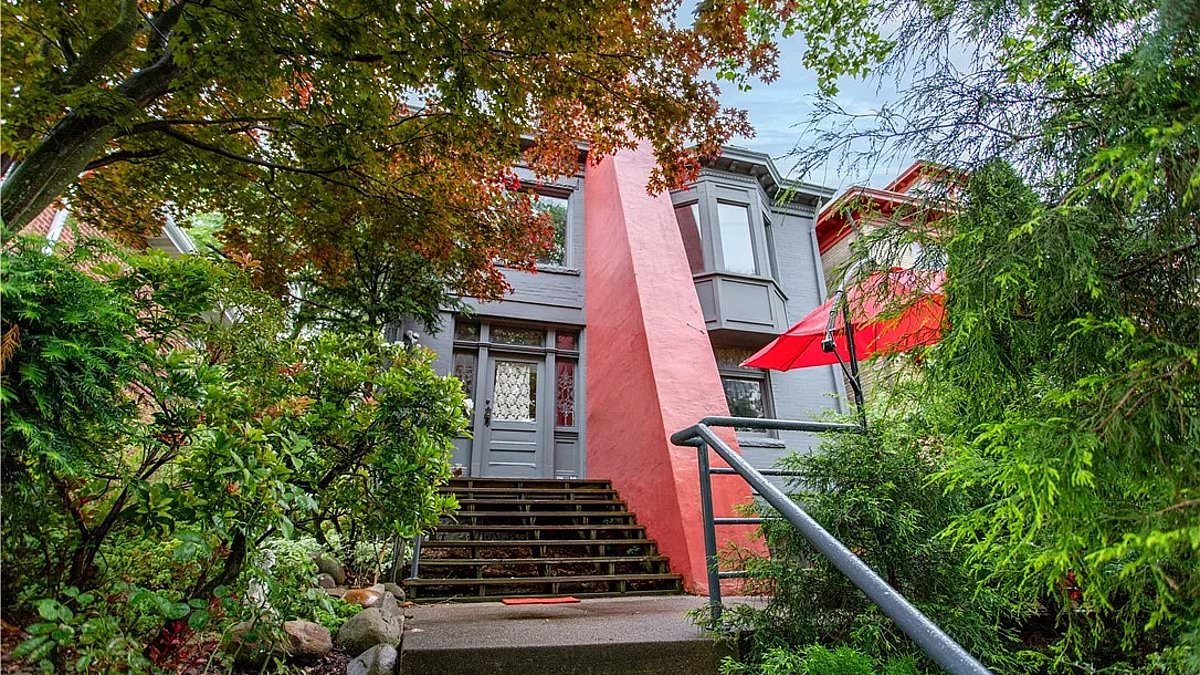 Located in leafy Squirrel Hill, the four-bedroom, three-and-a-half bathroom property is distinguished by a striking feature: a fire-engine red exclamation point, resembling a two-story wall that bursts forth from the front of what otherwise appears to be a typical gray-brick house.