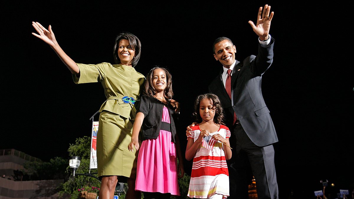 Michelle and Barack Obama pictured with daughters Sasha (in white) and Malia (in black and white patterned dress) while living in the White House in 2009