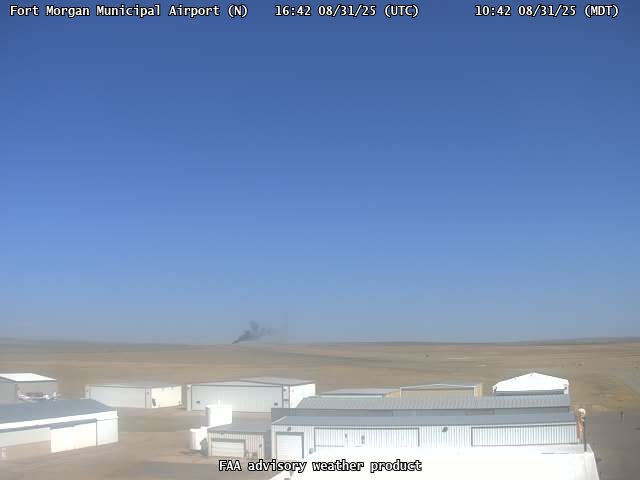 A photo taken by an FAA camera shows the airfield with a plume of dark smoke on the horizon. Fort Morgan is about 80 miles northeast of Denver.