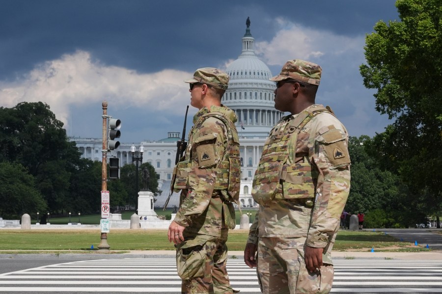 Soldiers from the District of Columbia National Guard patrol along the National Mall near the U.S. Capitol Thursday, Aug. 14, 2025, in Washington. The U.S. Capitol is seen in the distance. (AP Photo/Jacquelyn Martin)