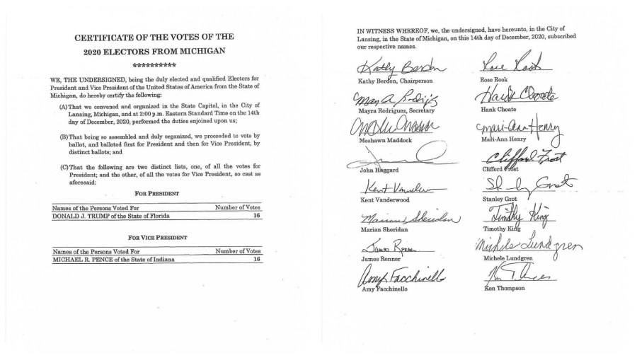 The group had been accused of meeting in December 2020 to sign a document falsely stating that they were Michigan’s electors and directing the state’s votes to former President Donald Trump. That document was sent to the U.S. Senate and the National Archives.