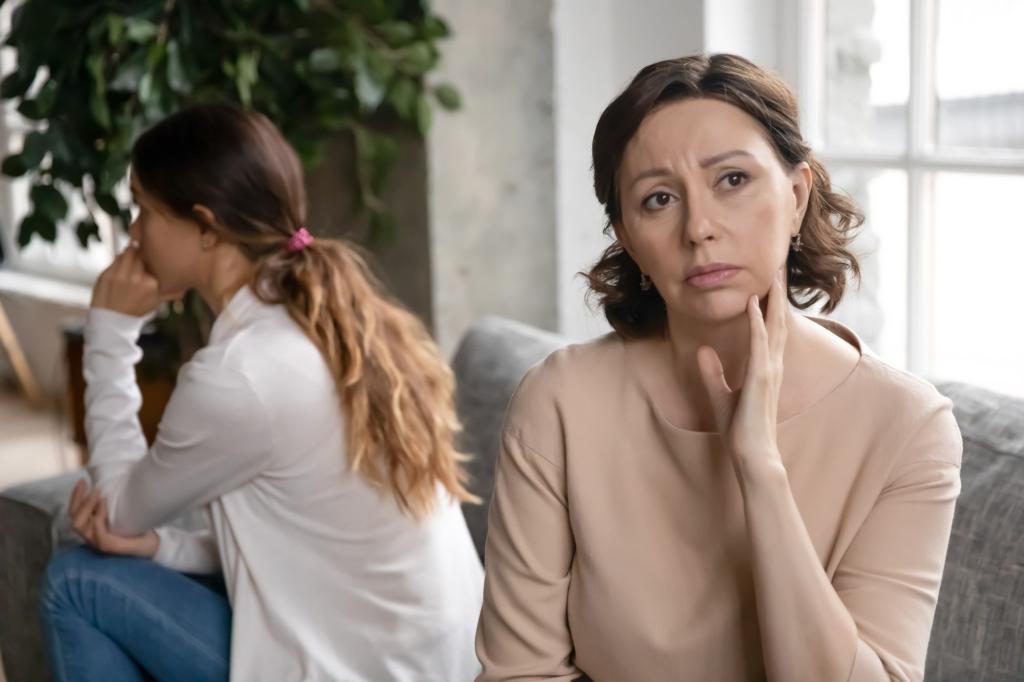Upset senior mother and adult daughter ignoring each other after a family quarrel, illustrating a concept of generation gap