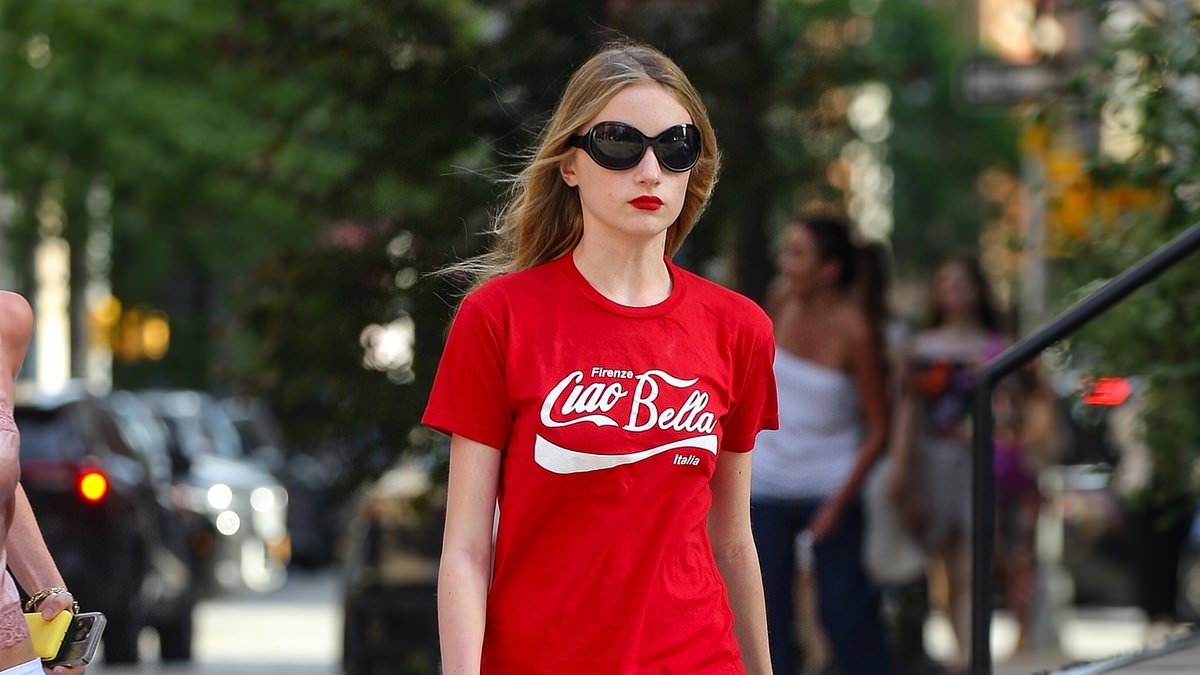 Kai, 16, showed off her long legs in a pair of distressed denim shorts and a red t-shirt while on a walk in New York City this week.