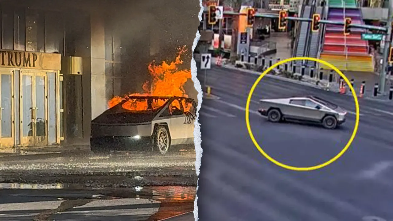 The first video shows the Tesla Cybertruck slowly leaving the hotel’s valet area earlier in the morning, while the second video is taken from inside the hotel and shows the truck exploding, sending flames and fireworks into the air.