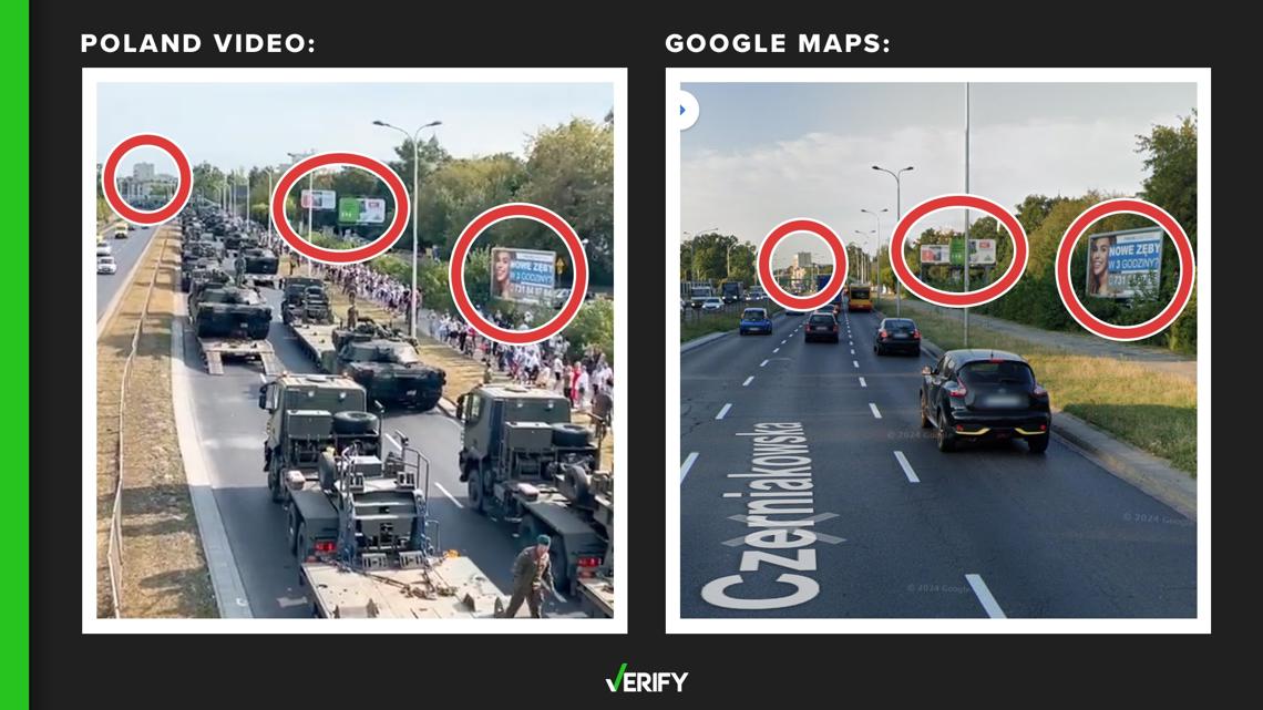 At the beginning of the video shared on social media, there’s a high-rise building in the distance. That same building is visible on Google Maps’ street view of the road in Warsaw.