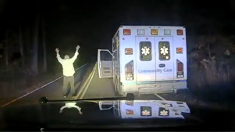 Footage captured by a dashboard camera reveals the Geauga County Sheriff’s Office reacting promptly to reports of an ambulance theft from University Hospitals Geauga Medical Center late on Tuesday night.