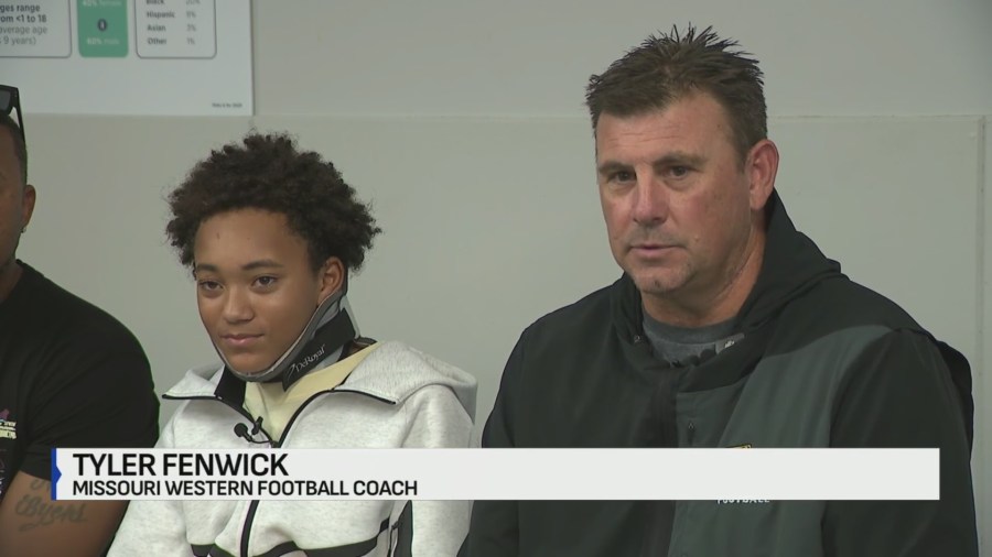 Wednesday’s therapy session begins with a visit from Tyler Fenwick, head football coach at MoWest. The coach arrived with gifts, including a MoWest jersey bearing the number 13, Byers’ number at Liberty High. The coach also invited Byers to conduct the opening coin toss at a Griffons game in two weeks, where he’ll suit up as an honorary captain.