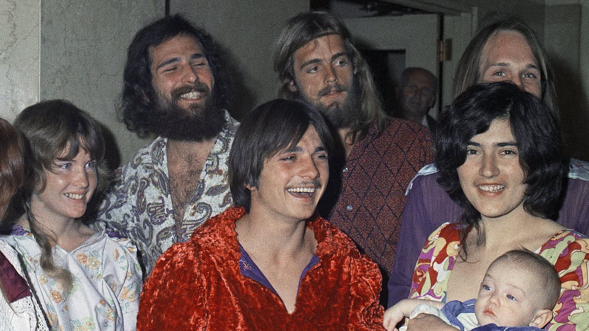 Manson Family members Lynette Fromme, Sandra Good, Mark Ross, Paul Watkins, and Catherine Share are seen holding Sandra’s son Ivan in February 1970