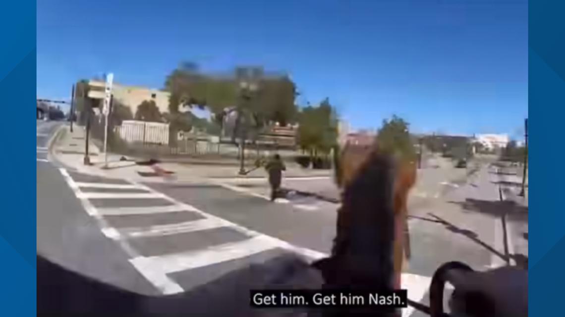 Body camera footage show multiple mounted units talking to Wilson, who turns around and runs through a road, causing a driver to slam on their brakes. An officer riding Police Service Horse Nash tells Wilson to get on the ground or he’ll “get run over.” They run through a parking lot and past a restaurant’s drive-thru.